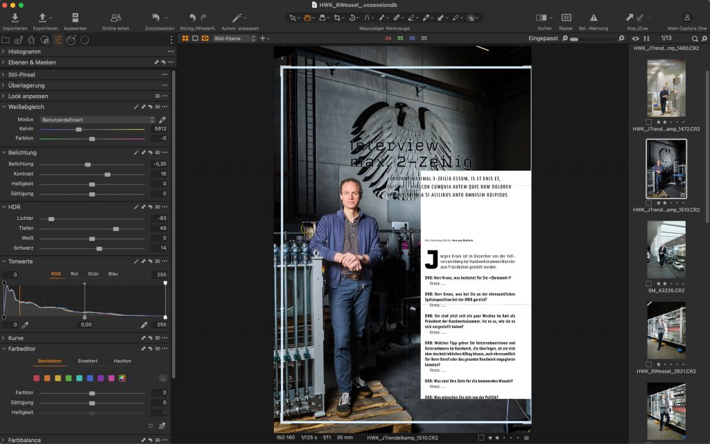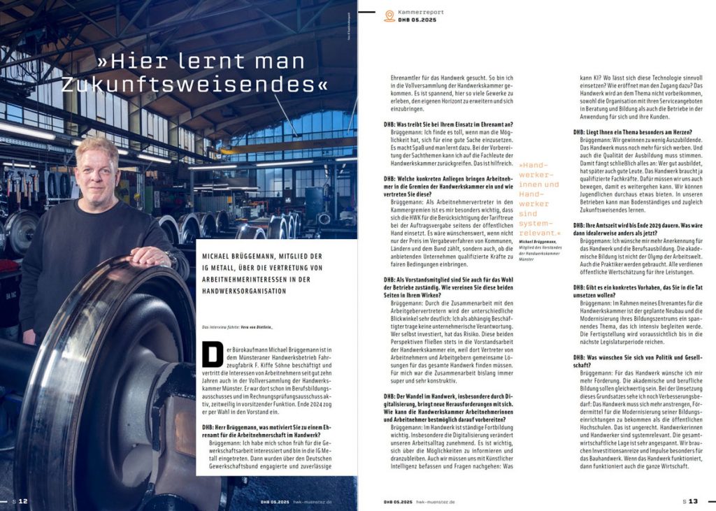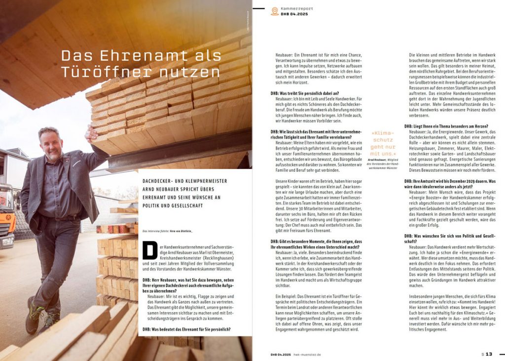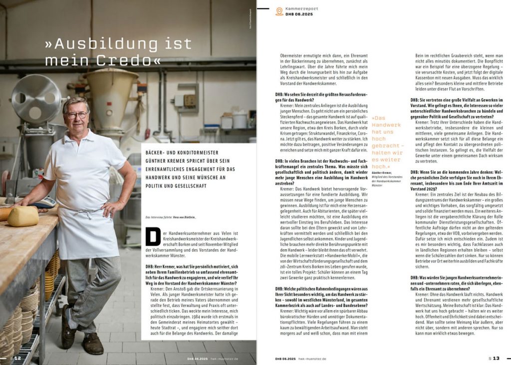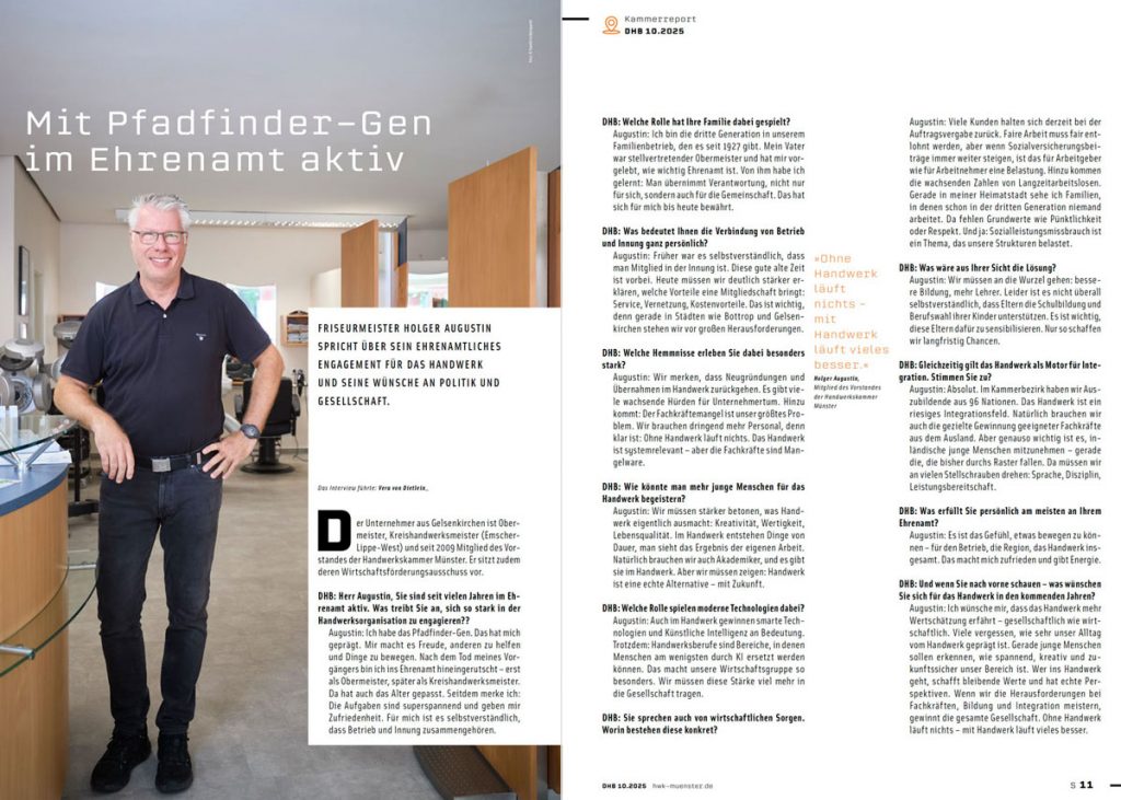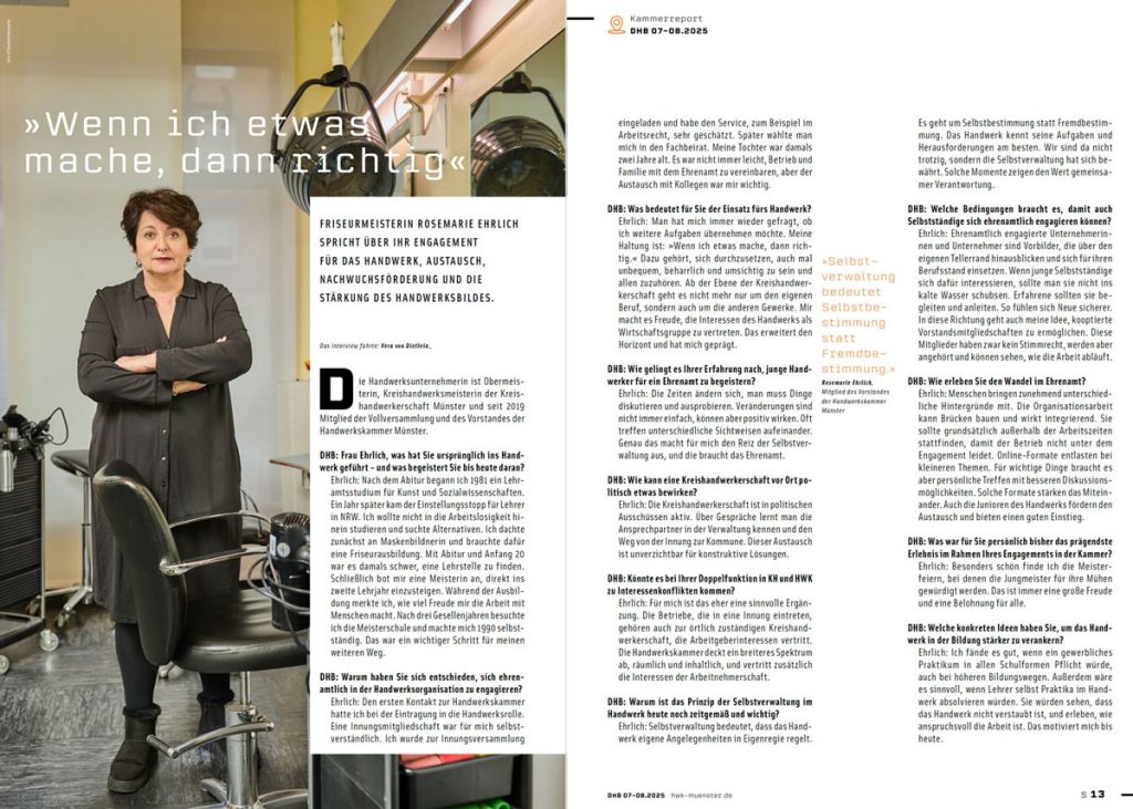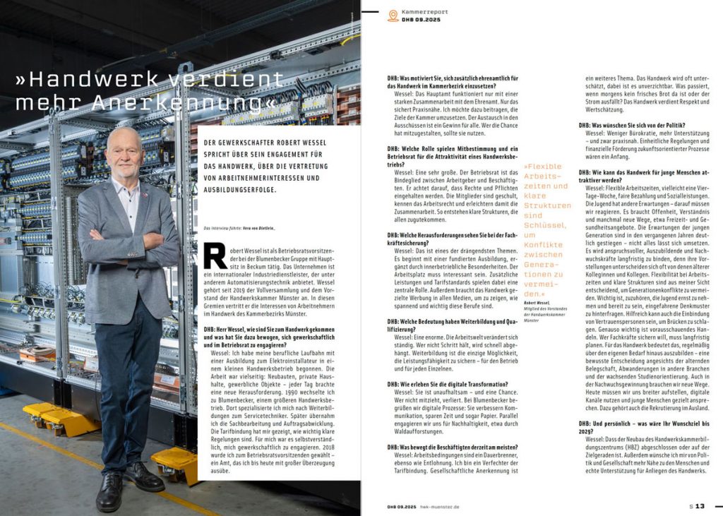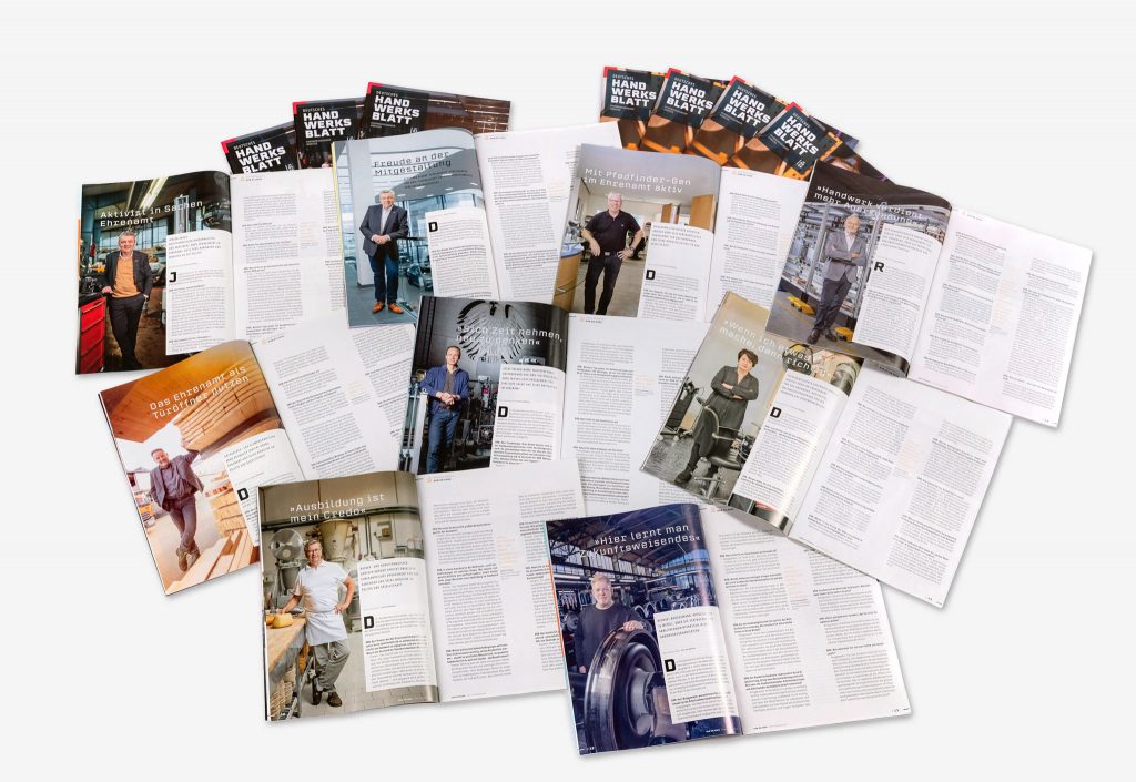 Ein gutes Beispiel dafür war unsere Arbeit für das Deutsche Handwerksblatt. Für die Handwerkskammer Münster durften wir den neuen Vorstand in einer Serie porträtieren. Die Aufgabe: Jede Person sollte im eigenen Berufsumfeld fotografiert werden – und trotzdem sollte die Serie als Ganzes ein einheitliches Layout ergeben.