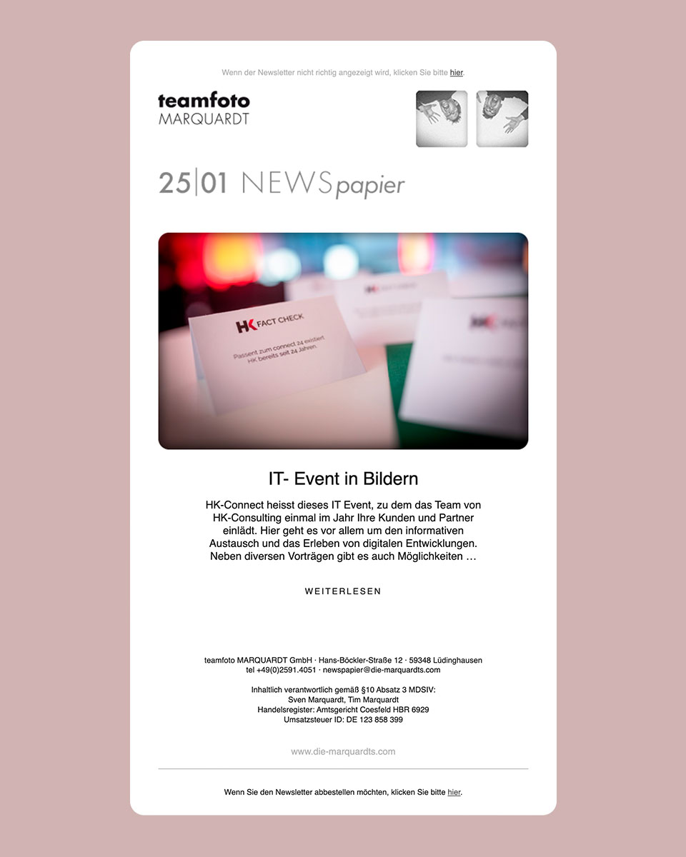 Seit 2013|14 erstellen wir unseren Newsletter. Dort lassen wir euch etwas an unserer Arbeit teilhaben und erlauben euch einen Blick hinter die Kulissen. Wir haben bereits früh erkannt, dass in der Welt des SocialMedia das „Versteck-spielen“ in unserer Branche passé ist und zeigen euch was Backstage so passiert. Worauf wir achten, wie der Aufbau aussieht oder welches Licht wir einsetzten. Wir bekommen überdurchschnittlich gutes Feedback von unseren Abonnenten und freuen uns auf rege Diskussionen. Gerne beantworten wir die ein oder andere Frage, wenn ihr wollt. Also, wenn es euch interessiert klickt einfach oben auf den Button: NEWSpapier anmelden – fertig!